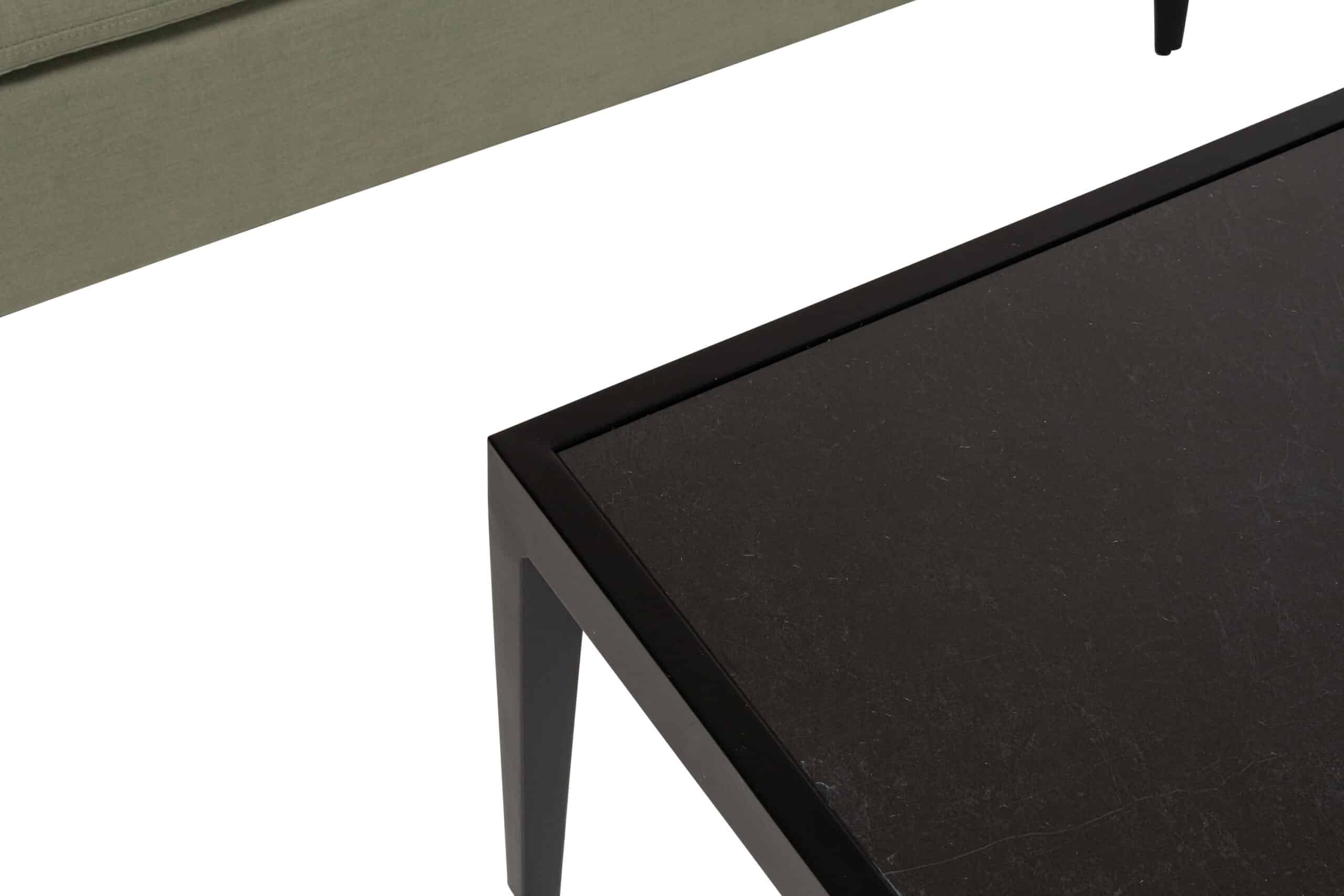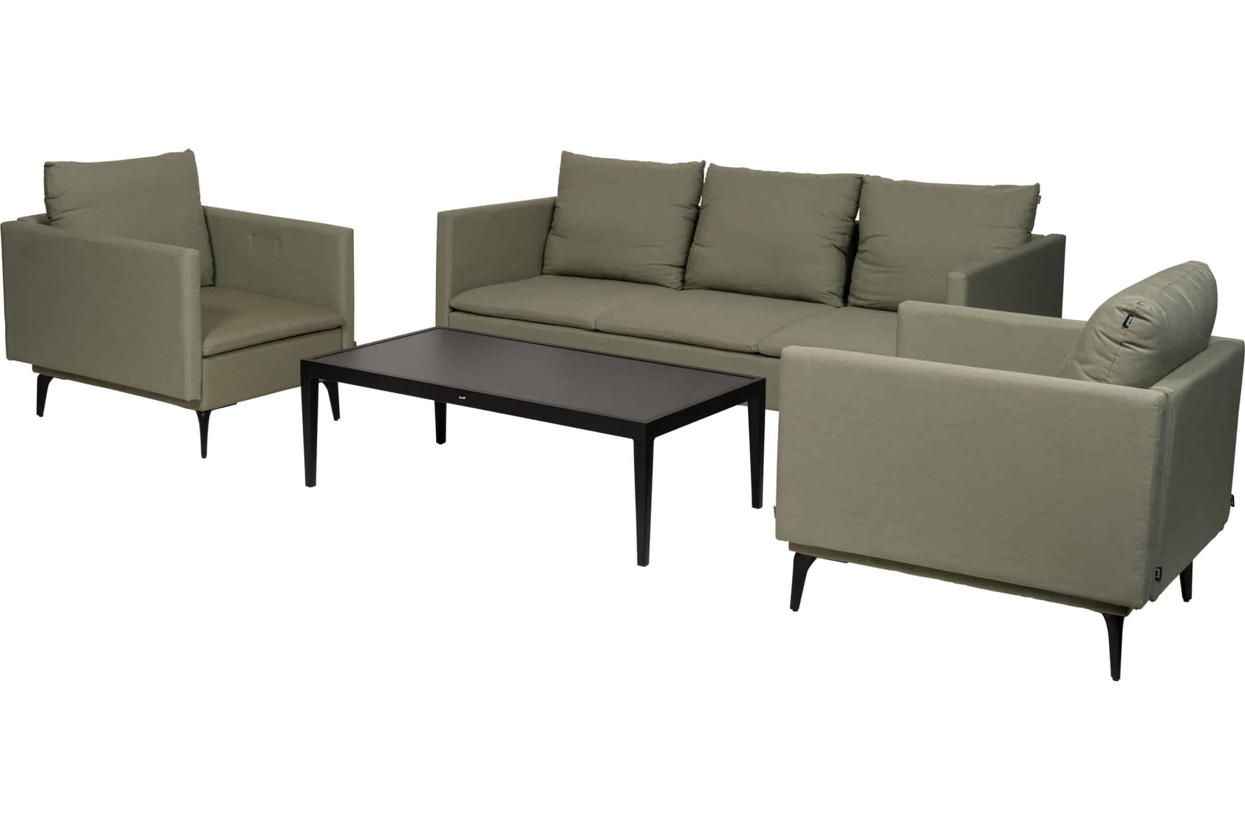Hunter sofagruppe består av en romslig 3-seter, to sofastoler og et sofabord med bordplate i keramisk flis — alt i sortlakkert aluminium som aldri ruster og holder seg pent sesong etter sesong. Gruppen er dimensjonert for å sitte lenge, og de brede setene gir god plass uten at møblene virker tunge i uttrykket.