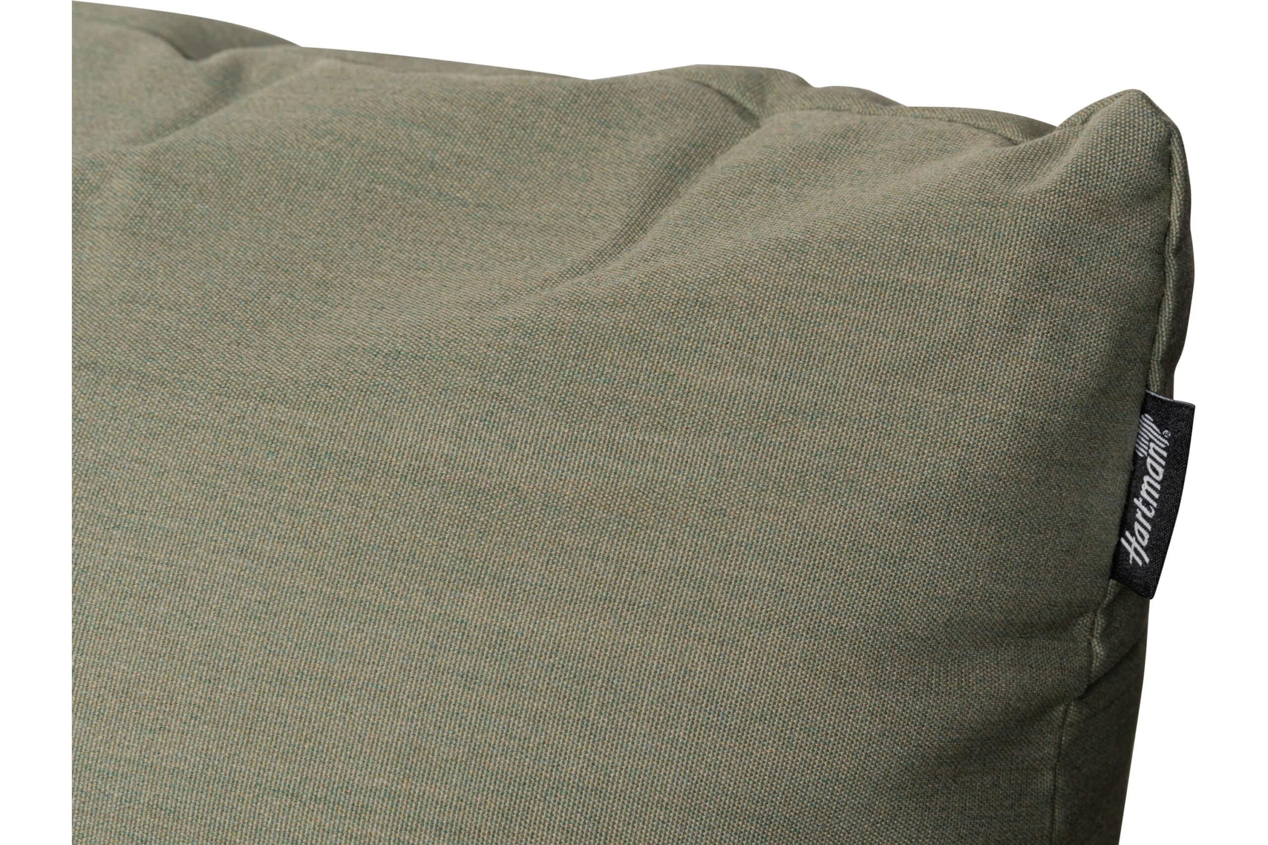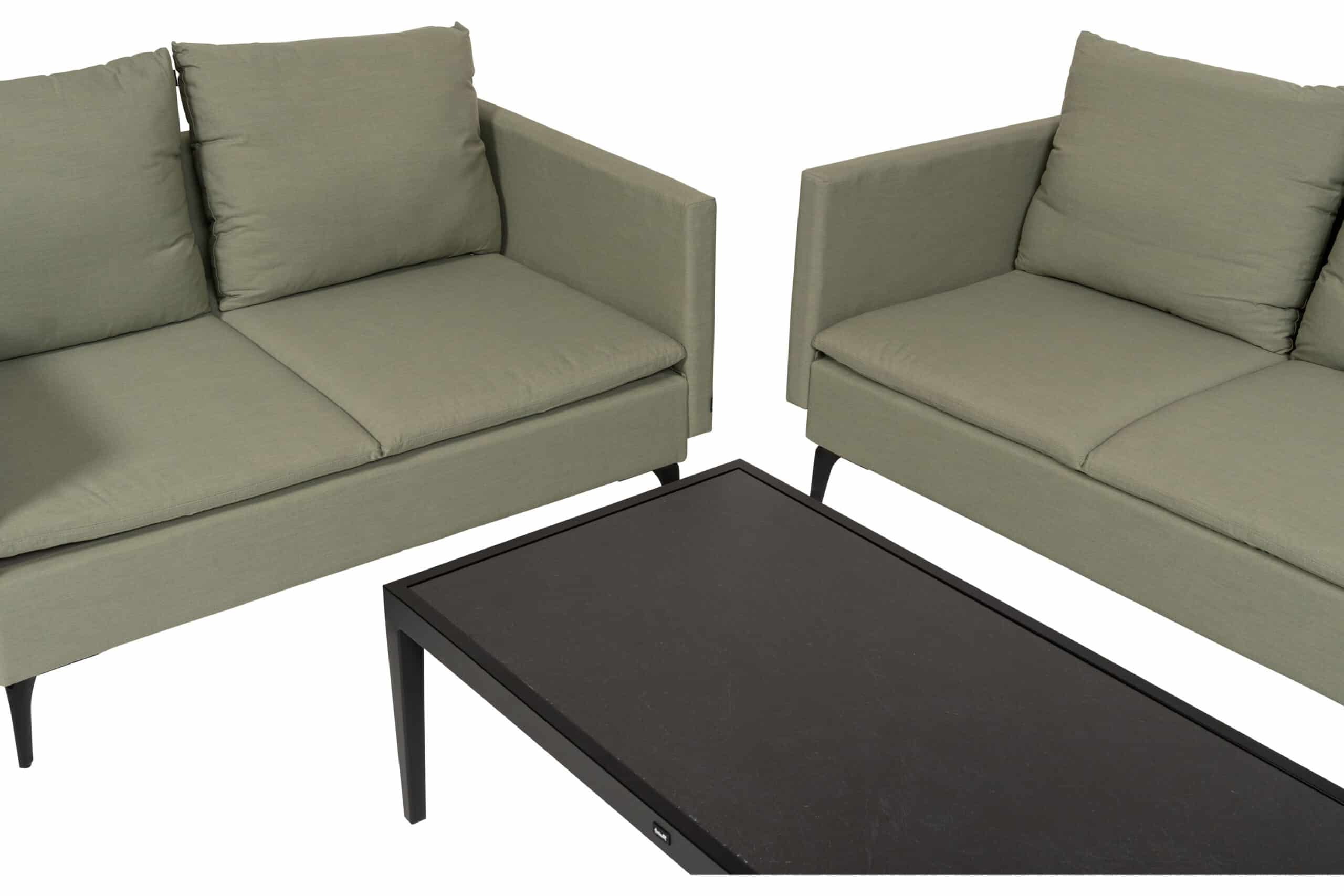 Alle puter er trukket i Sunbrella almond — en dempet salvie-grønn med olivenundertone som spiller godt mot det sortlakkerte aluminiumet. Skummet i setene er vanndrenerende, noe som gjør at gruppen tørker raskt etter regn og er klar til bruk igjen på kort tid. Tekstilet er enkelt å tørke av og har fem års garanti mot solfalming. Vanger og rygg kan tas av, noe som gjør rengjøring og eventuell oppbevaring enklere. Sett opp gruppen en gang — og la den stå.