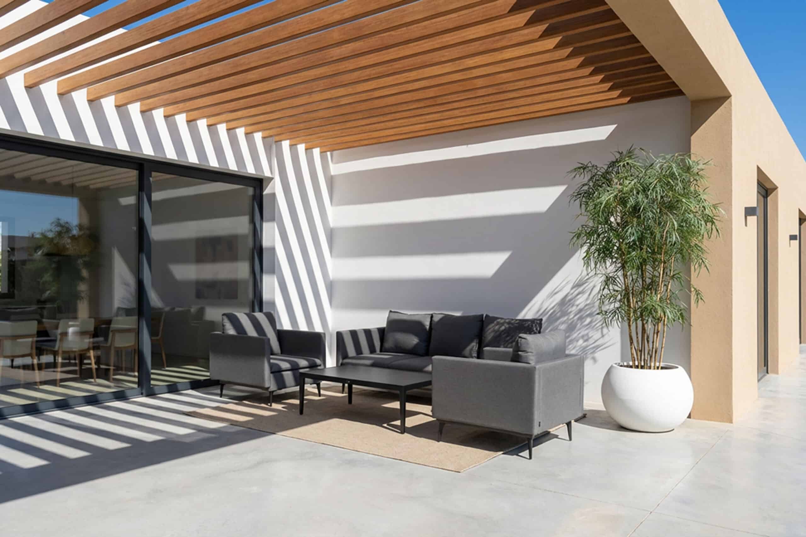 Alle puter er trukket i Sunbrella flanelle — en mørk antrasittgrå med lett melert tekstur som spiller godt mot det sortlakkerte aluminiumet. Skummet i setene er vanndrenerende, noe som gjør at gruppen tørker raskt etter regn og er klar til bruk igjen på kort tid. Tekstilet er enkelt å tørke av og har fem års garanti mot solfalming. Vanger og rygg kan tas av, noe som gjør rengjøring og eventuell oppbevaring enklere. Sett opp gruppen en gang — og la den stå.