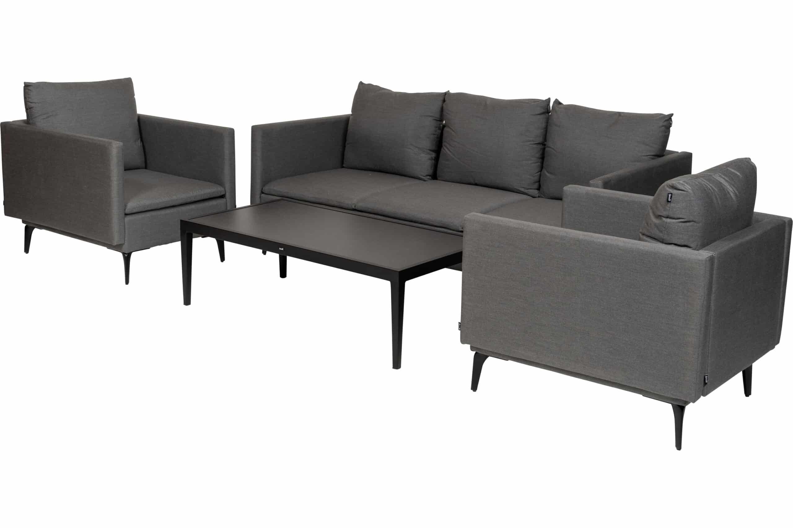 Hunter sofagruppe består av en romslig 3-seter, to sofastoler og et sofabord med bordplate i keramisk flis — alt i sortlakkert aluminium som aldri ruster og holder seg pent sesong etter sesong. Gruppen er dimensjonert for å sitte lenge, og de brede setene gir god plass uten at møblene virker tunge i uttrykket.