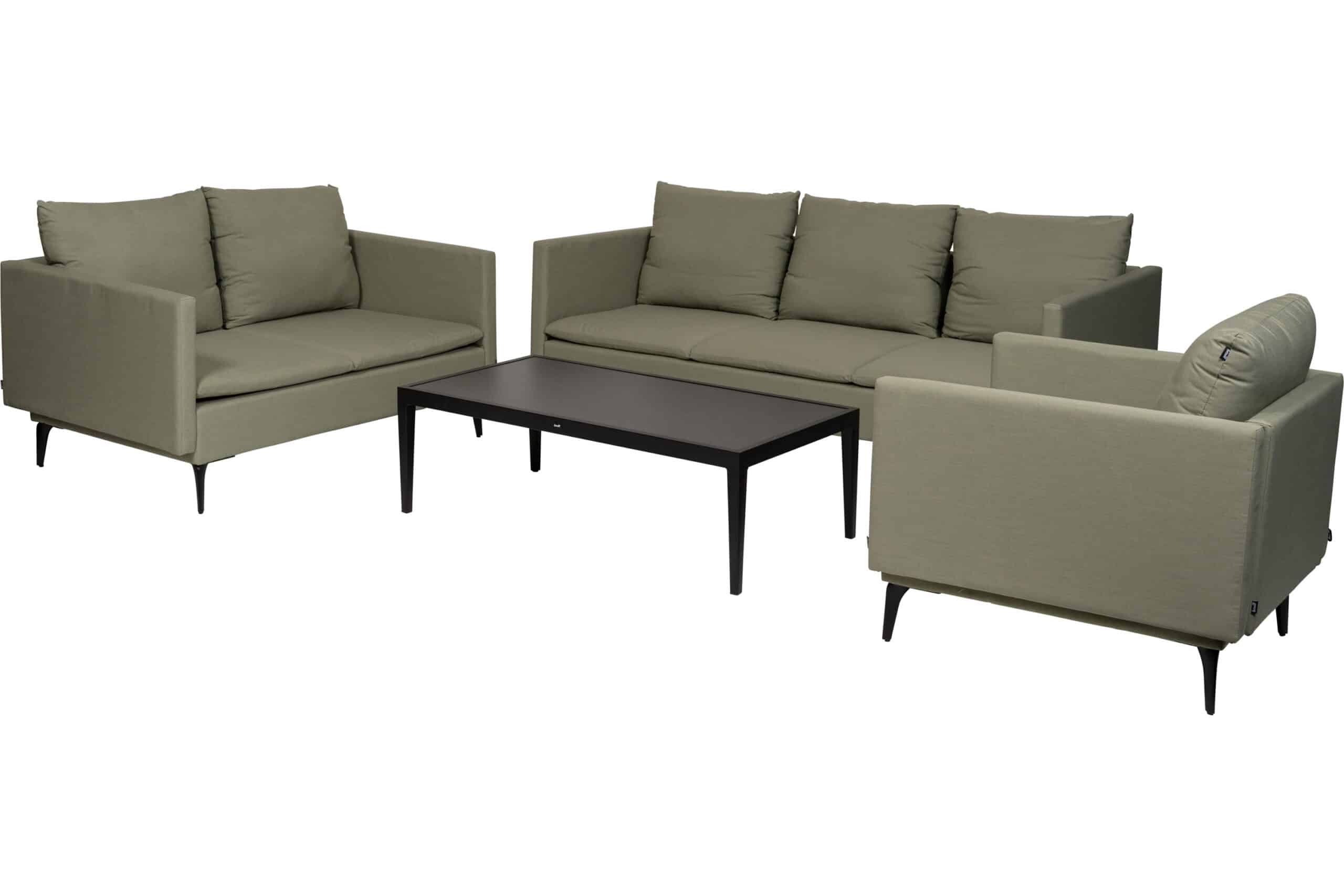 Hunter sofagruppe består av en 3-seter, en 2-seter og en sofastol — sammen med et sofabord med bordplate i keramisk flis. Alt er i sortlakkert aluminium som aldri ruster, og den større gruppen gir god sittekapasitet uten at det blir trangt mellom møblene.