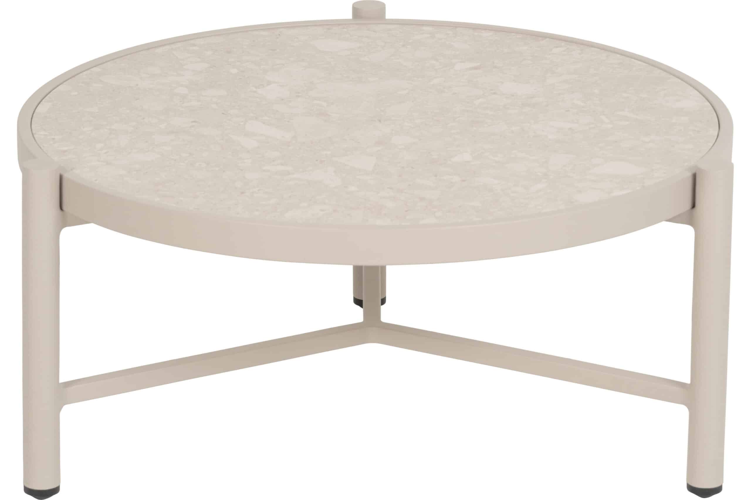 Nika sidebord ø62 er et dekorativt sidebord tilpasset Paris 3 seter lounge sofa. Aluminiumsrammen er lakkert i en varm beige fargetone, og bordplaten er av keramisk flis i design Terrazzo.
